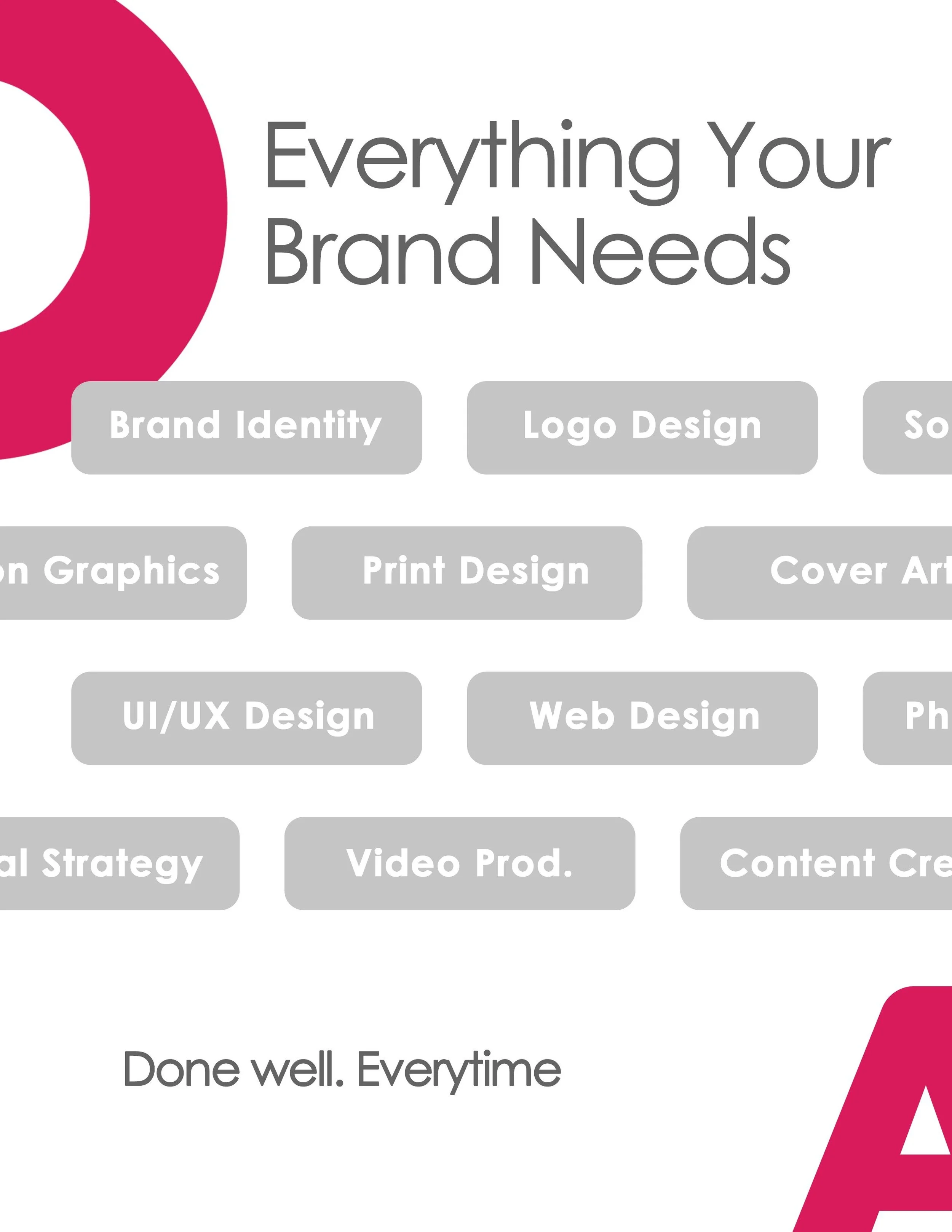 3D modeling, raw video footage shooting, podcast editing, long-form print design, and social media account management. Everything else, ask us.