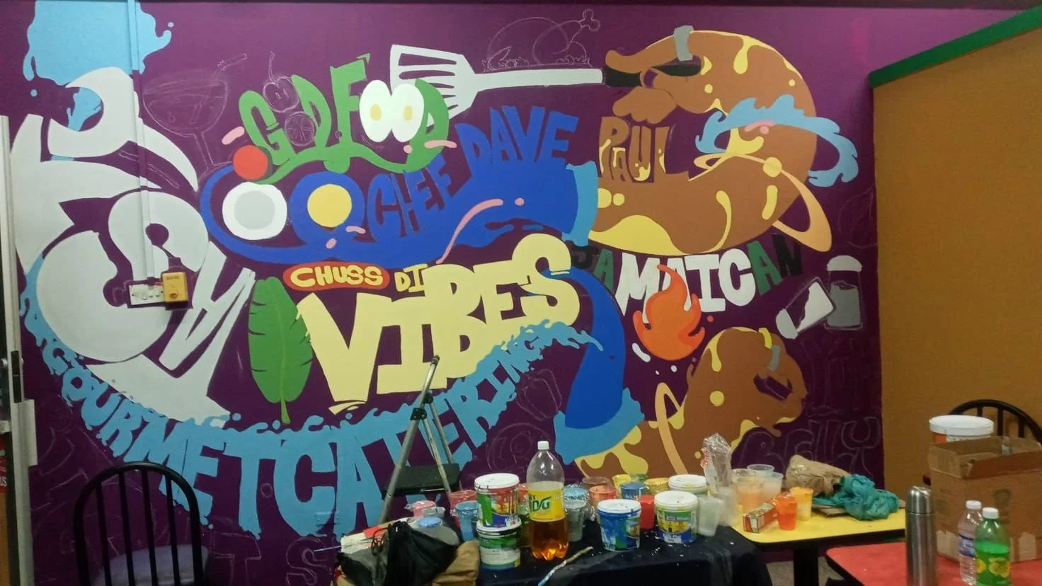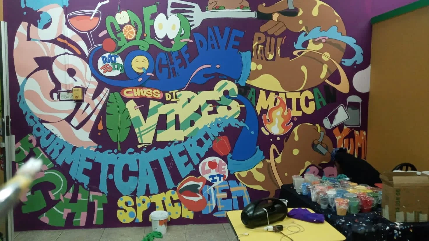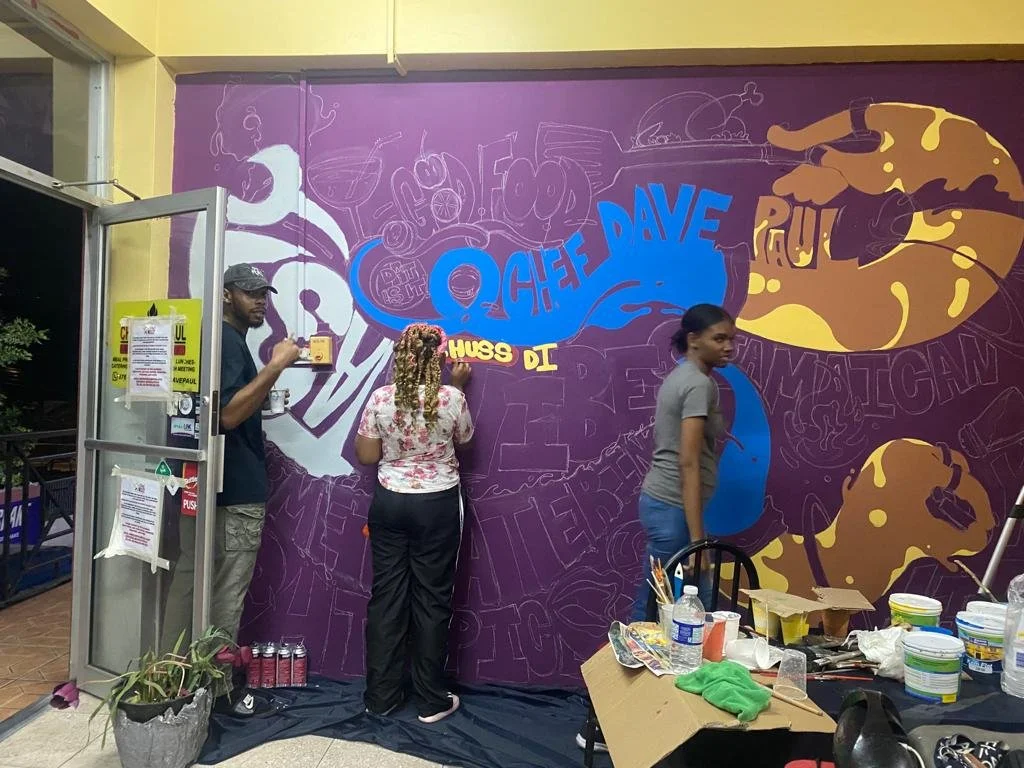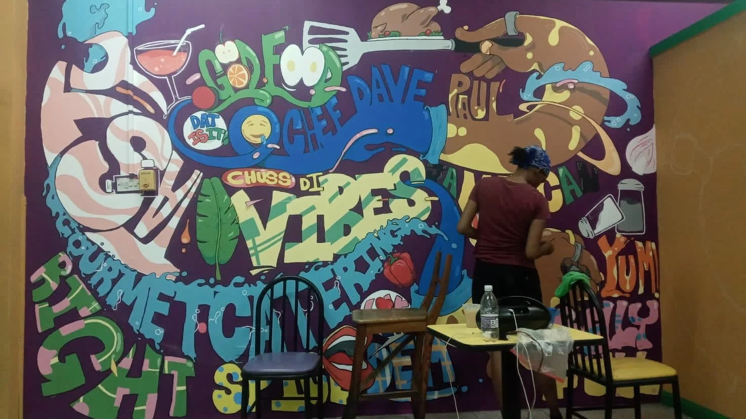 Hand-painted in vibrant colors with the team — Shantel Mason, Jason Cunningham, Rochelle Lola, and myself — this mural for Chef Dave Paul’s Kingston restaurant brings flavor to the walls just like his food brings flavor to the table.